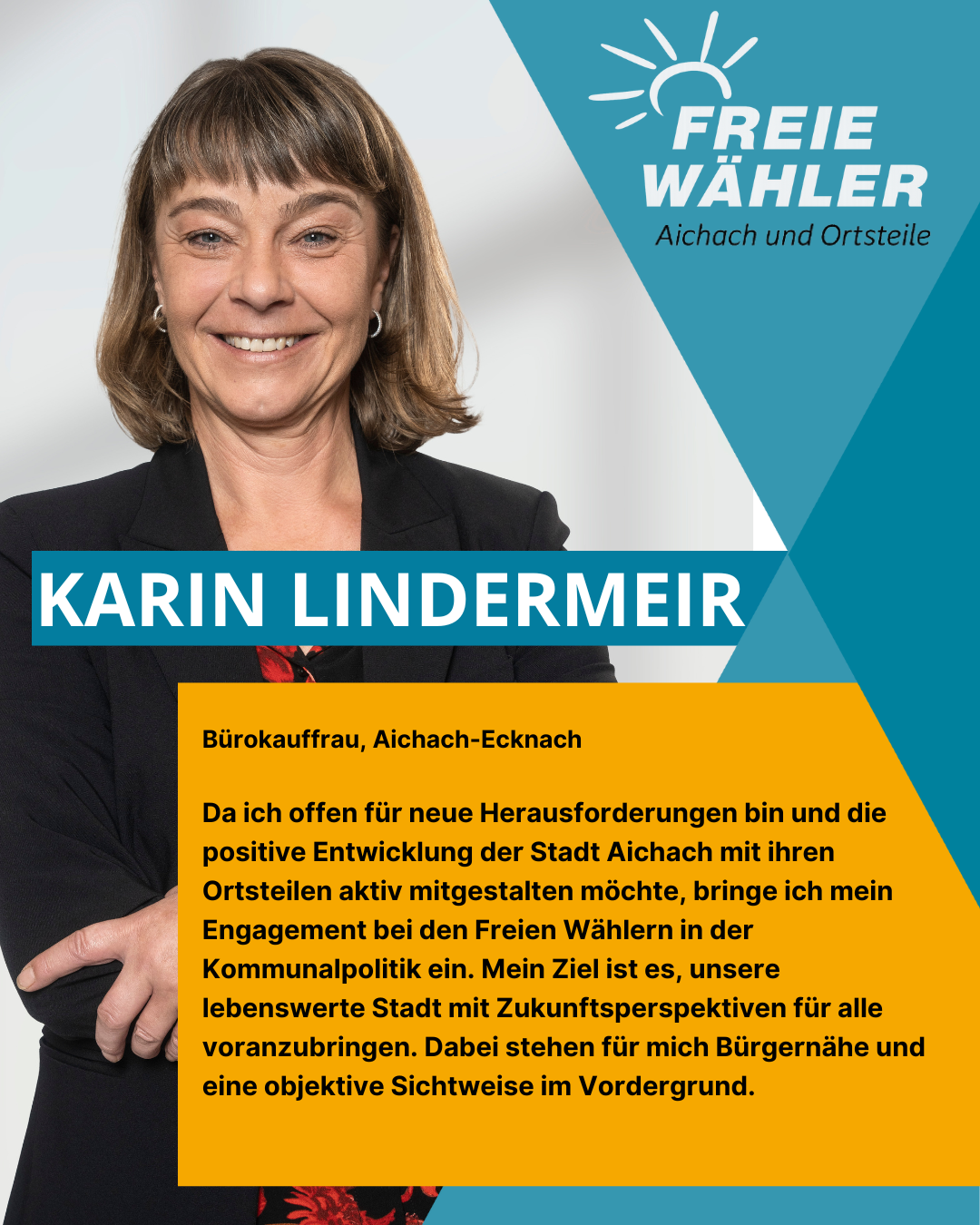 Da ich offen für neue Herausforderungen bin und die positive Entwicklung der Stadt Aichach mit ihren Ortsteilen aktiv mitgestalten möchte, bringe ich mein Engagement bei den Freien Wählern in der Kommunalpolitik ein. Mein Ziel ist es, unsere lebenswerte Stadt mit Zukunftsperspektiven für alle voranzubringen. Dabei stehen für mich Bürgernähe und eine objektive Sichtweise im Vordergrund.