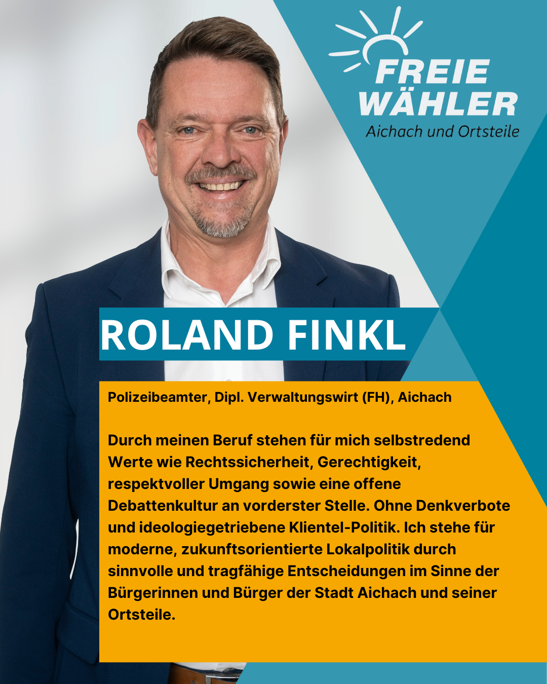 Durch meinen Beruf stehen für mich selbstredend Werte wie Rechtssicherheit, Gerechtigkeit, respektvoller Umgang sowie eine offene Debattenkultur an vorderster Stelle. Ohne Denkverbote und ideologiegetriebene Klientel-Politik. Ich stehe für moderne, zukunftsorientierte Lokalpolitik durch sinnvolle und tragfähige Entscheidungen im Sinne der Bürgerinnen und Bürger der Stadt Aichach und seiner Ortsteile.